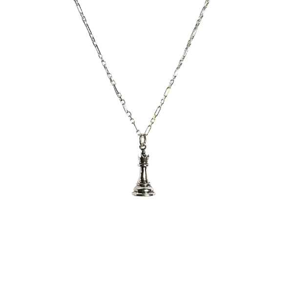 This sterling silver necklace showcases the Queen - the most powerful piece in the game of chess - captured in elegant detail. Symbol of wit, strength, and cunning intrigue, she commands attention while keeping her secrets close.