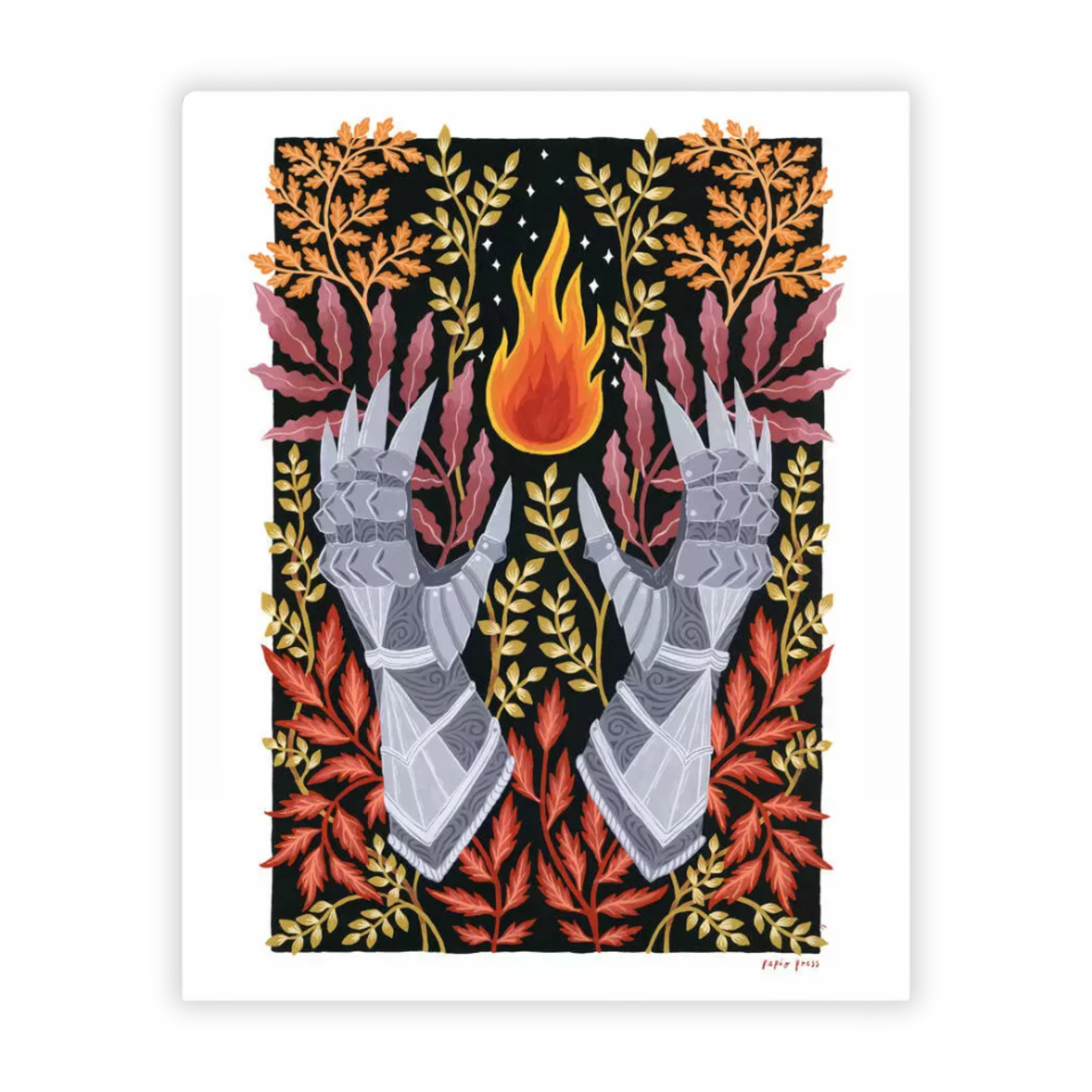 Ignited amongst the fiery plants a flame burns bright with bravery. The Gauntlets, a beautiful inkjet print of an original Illustration by Harry & Zanna Goldhawk of Papio Press, features a fantasy and nature-inspired illustration, evocative of heroic tales and stories dowsed in kindled courage.